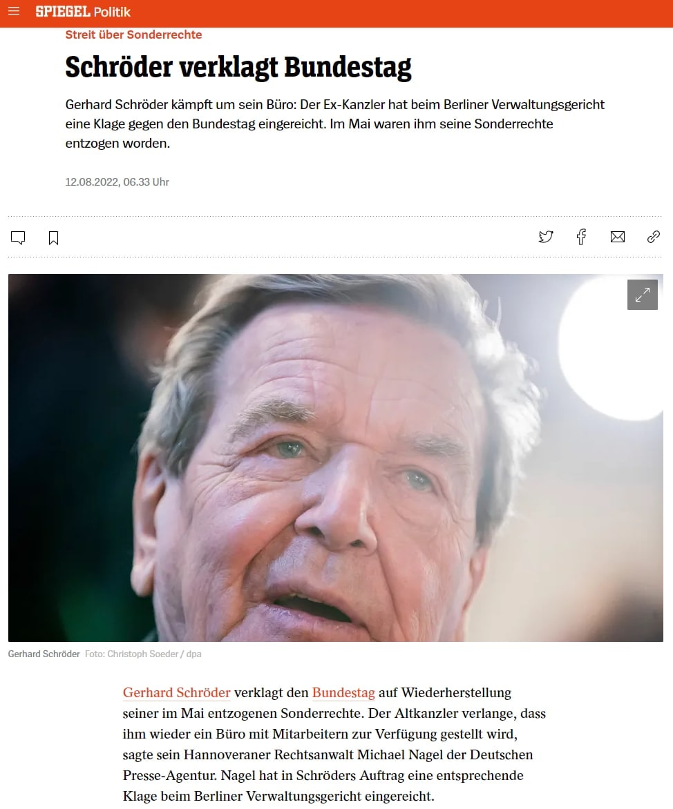 Иск в админсуд Берлина от имени Шредера подал его адвокат.