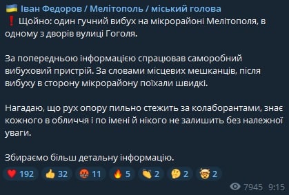 10:59 В оккупированном Мелитополе около 9 утра прогремел взрыв, сообщил мэр города Иван Федоров.