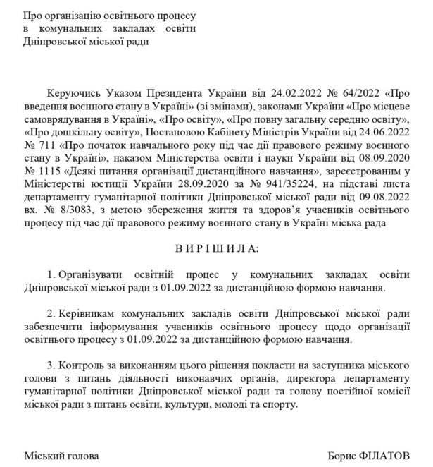 В проекте решения сессии Днепровского горсовета "Про организацию образовательного процесса в коммунальных учреждениях города" говорится, что с 1 сентября школы Днепра работают в дистанционном формате.