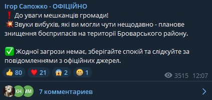 Мэр Броваров Игорь Сапожко сообщает, что это плановое уничтожение боеприпасов на территории Броварского района.