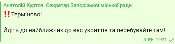 Об этом сообщил секретарь Запорожского горсовета Анатолий Куртев в своем тг-канале.