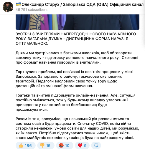 Власти Запорожской области провели встречи с родителями школьников и педагогами касательно формы обучения в новом учебном году. Все стороны высказали мнение, что удаленка - это оптимальное решение.