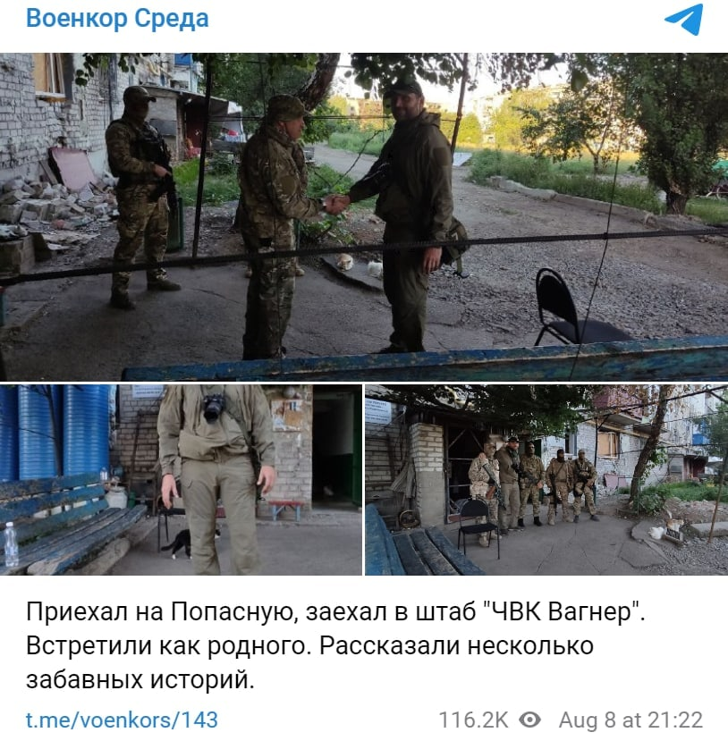 В российских телеграм-каналах напоминают, что фото этой базы 8 августа выкладывал "военкор Среда", который, судя по снимкам, общался там с куратором "Вагнера" Евгением Пригожиным.