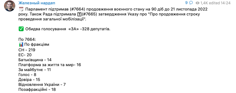 Нардеп Ярослав Железняк сообщает, что за продление военного положения проголосовали 328 депутатов: