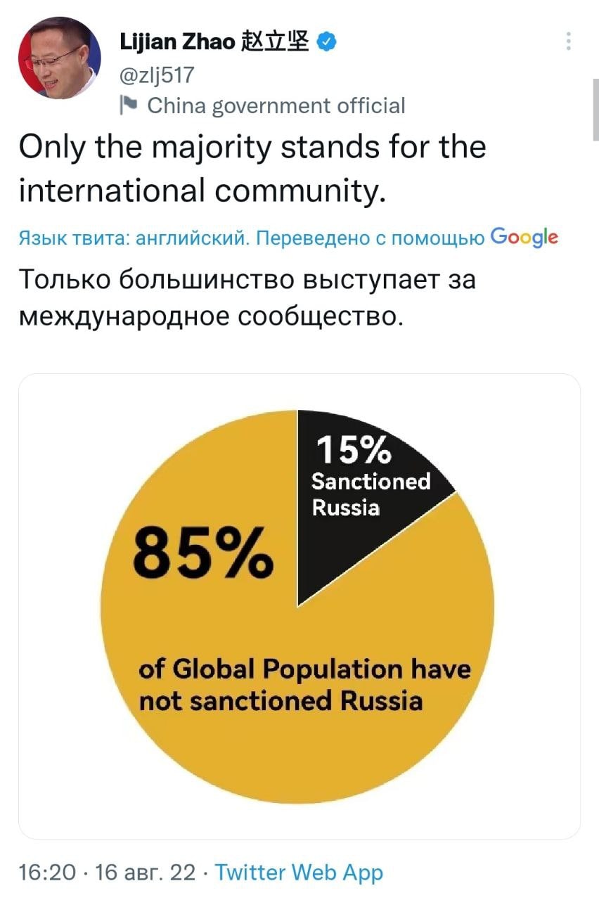 Представитель МИД КНР Чжао Лицзянь заявил, что страны, представляющие 85% населения планеты, отказались вводить санкции против Москвы.