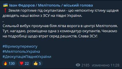 21:57 Мэр Мелитополя Иван Федоров публикует фото пожара в курортной Кирилловке (неподконтрольная часть Запорожской области) в результате обстрела.