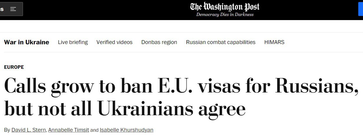 Как сообщал американский телеканал CNN, Европа не может решить, хочет ли она наказать россиян за путинскую войну лишением их права на въезд в страны ЕС. Хотя Финляндия, Эстония, Чехия и Латвия поддержали ограничения виз россиянам, но единства в вопросе нет.