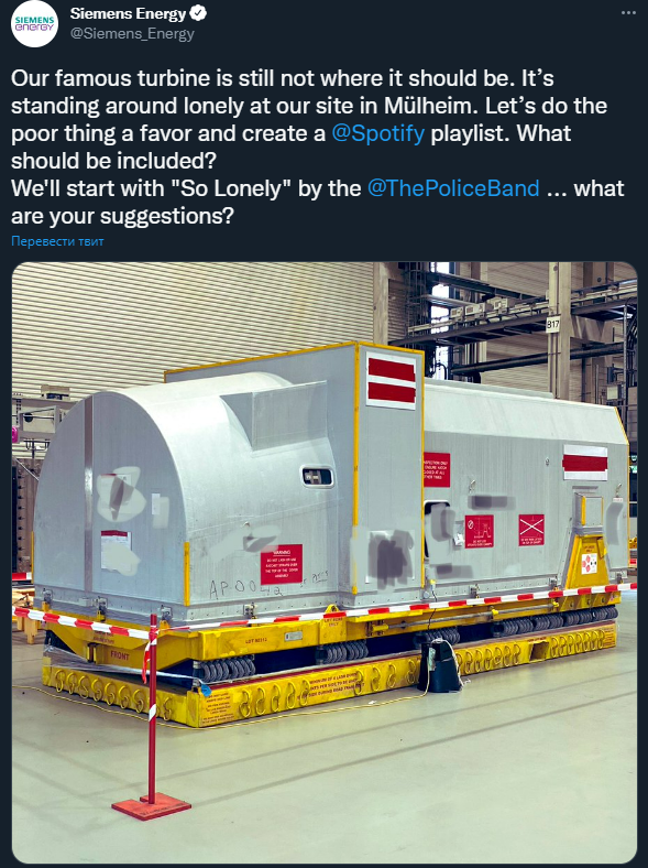 "Наша знаменитая турбина все-таки не там, где должна быть. Она стоит в одиночестве на площадке в Мюльхайме. Давайте сделаем бедняге одолжение и создадим для нее плейлист в Spotify", - предложила компания в Twitter.