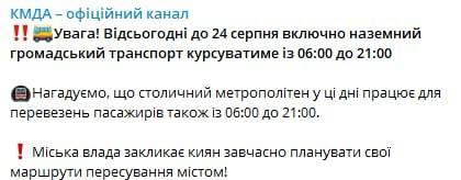 В Киеве с сегодняшнего дня и до 24 августа включительно наземный общественный транспорт будет работать по сокращенному режиму, как и метро. Делается это из-за угрозы ракетных ударов на День независимости Украины.