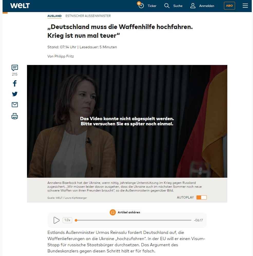 10:03 Страны Балтии направили Еврокомиссии свои предложения по 8-му пакету санкций против России. Они касаются мер в отношении торговли, энергетики, а также новые ограничения по SWIFT, сообщил глава МИД Эстонии Урмас Рейнсалу в беседе с немецкой газетой Die Welt.