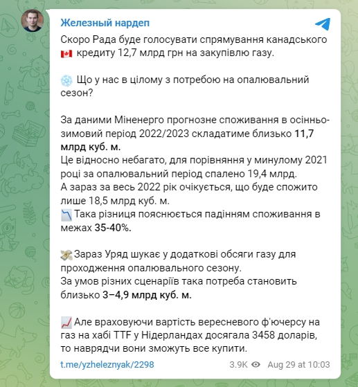 При разных сценариях такая потребность составляет около 3-4,9 млрд куб. м. "Но учитывая стоимость сентябрьского фьючерса на газ на хабе TTF в Нидерландах достигала 3458 долларов, вряд ли они смогут все купить", - пишет Железняк.