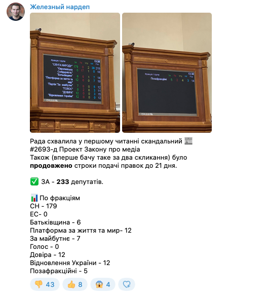 Голоса насобирали с трудом - "за" только 233 депутата, сообщил нардеп Ярослав Железняк. Даже "Слуги народа" дали всего 179 голосов.