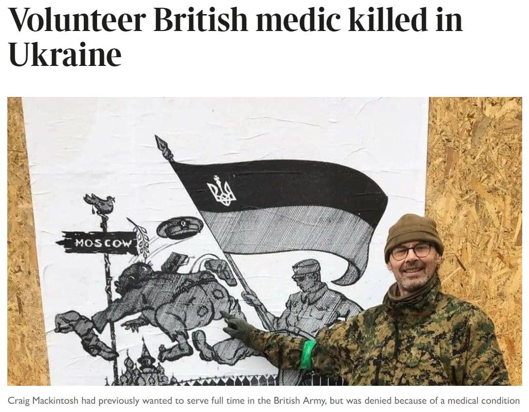 48-летний парамедик Крейг Макинтош был смертельно ранен в шею 24 августа, в День независимости Украины. В их машину попал снаряд. Британец погиб, когда перевязывал раненого сослуживца.