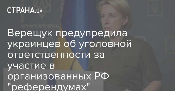 Министр по вопросам реинтеграции временно оккупированных территорий Ирина Верещук в эфире телемарафона призвала украинцев эвакуироваться с оккупированных территорий и пригрозила ответственностью за участие в "референдумах" РФ.