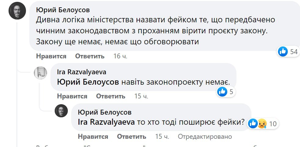 "Странная логика министерства назвать фейком то, что предусмотрено действующим законодательством с просьбой верить проекту закона. Закона еще нет, нечего обсуждать", - написал член Научно-консультативного совета при Председателе Верховной Рады Украины Юрий Белоусов.