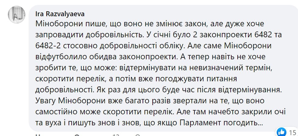 "Минобороны пишет, что оно не изменяет закон, но очень хочет ввести добровольность. В январе было 2 законопроекта 6482 и 6482-2 относительно добровольности учета. Но именно Минобороны отфутболило оба законопроекта. А теперь даже не хочет сделать то, что может отсрочить на неопределенный срок, сократить перечень, а потом уже согласовывать вопросы добровольности. Как раз для этого будет время после отсрочки. Минобороны уже много раз обращали на то, что оно самостоятельно может сократить перечень. Но там вроде бы закрыли глаза и уши и пишут снова и снова, что если парламент согласует...", - комментирует Ирина Разваляева из Харькова.