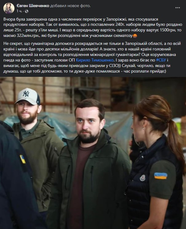 "А знаете, кто в нашей стране главный ответственный за контроль и распределение международной гуманитарки? Эта коррумпированная гнида на фото – заместитель председателя ОП Кирилл Тимошенко", - написал Шевченко.