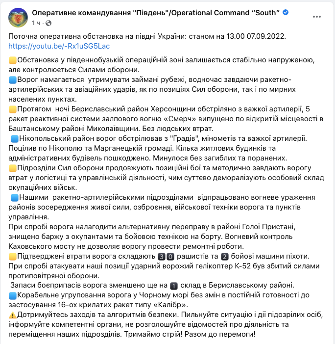Оперативное командование "Юг" сообщает об очередных успехах на южном направлении. Фото: facebook/GeneralStaff.ua