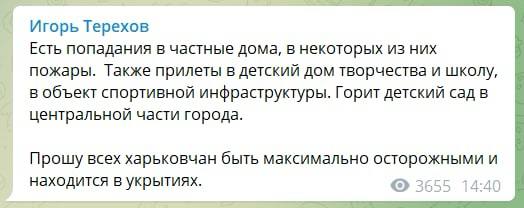Также пострадал детский дом творчества, школа и объект спортивной инфраструктуры. В центре Харькова горит детский сад.