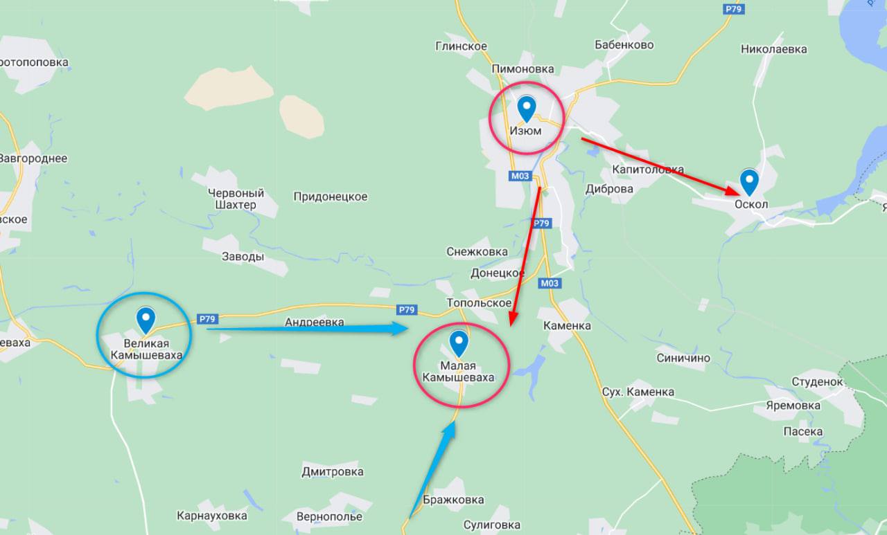 При этом российские телеграм-каналы сообщают, что их силы смогли уйти из Изюма и из его окрестностей (в том числе и к югу от города, вырвавшись из окружения) на восток, в город Оскол и далее - на восточный берег одноименной реки.