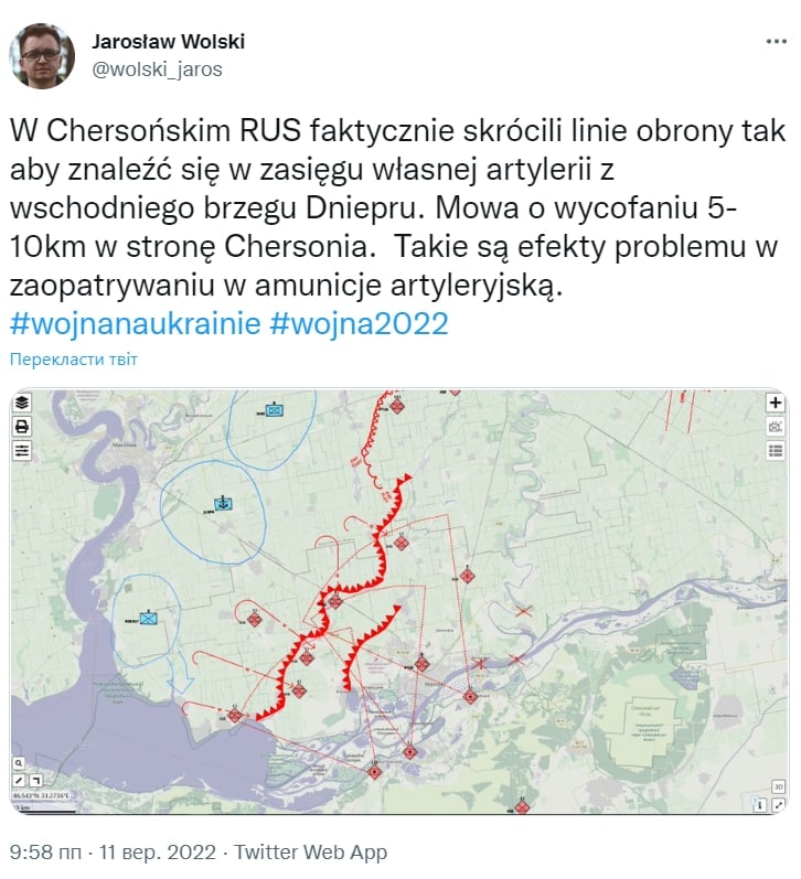 09:25 В Херсонской области войска РФ сократили линию фронта и отступили на 5-10 км в сторону Херсона от своих позиций для того чтобы быть в досягаемости собственной артиллерии на левом берегу Днепра, пишет польский специалист по работе с открытыми данными Ярослав Вольски.