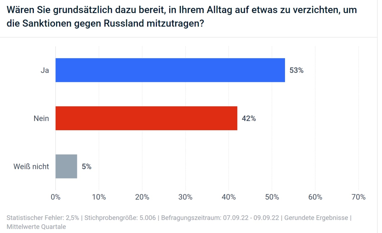 В то же время электорат свободных демократов, левых и правая "Альтернатива для Германии" преимущественно против личных жертв ради санкций.