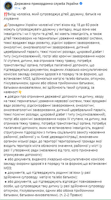 Государственная пограничная служба Украины в своем Facebook рассказала, в каких случаях мужчины призывного возраста могут покидать пределы страны, сопровождая супругу или детей.