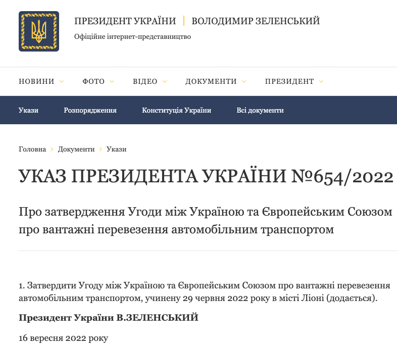 Президент Владимир Зеленский утвердил "транспортный безвиз" - соглашение между Украиной и Евросоюзом о либерализации грузовых автомобильных перевозок.
