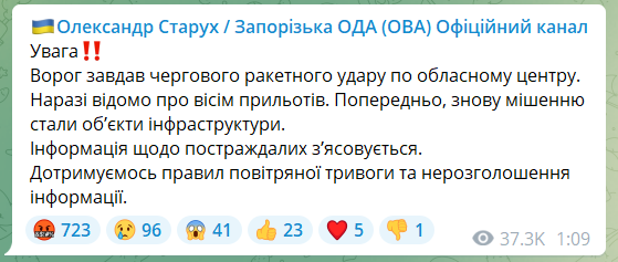 Об этом в телеграм-канале сообщил глава Запорожской ОВА Александр Старух.