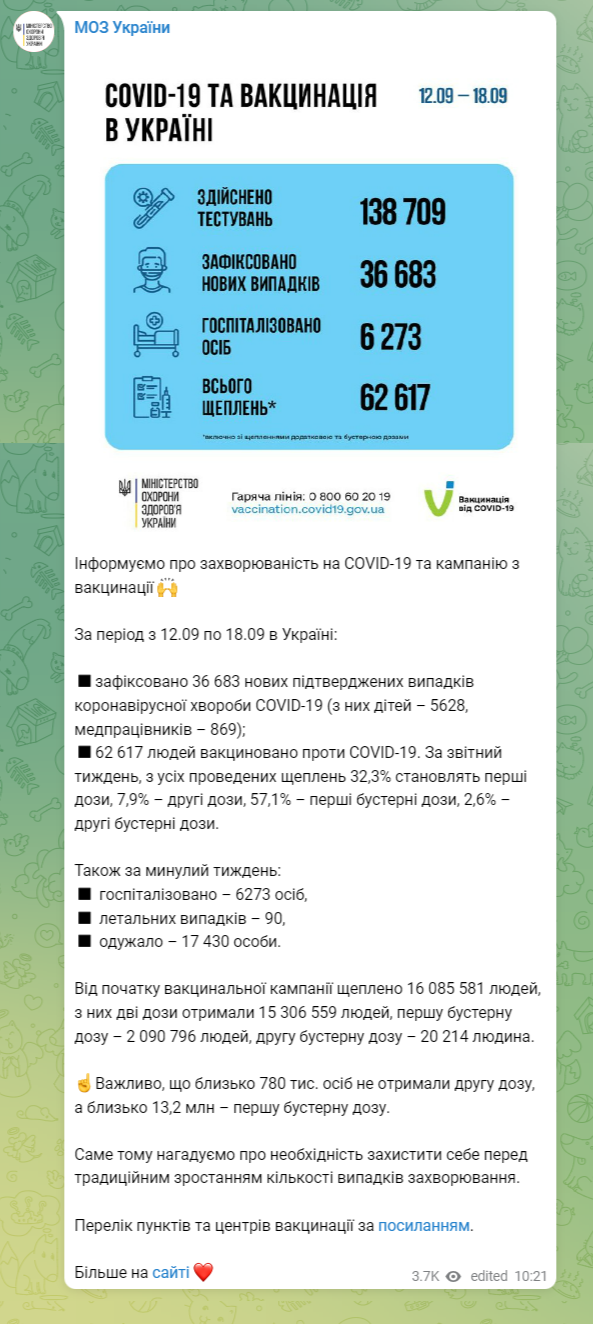 По данным Министерства здравоохранения, в период с 12  по 18 сентября в Украине зафиксировано 36 683 новых подтвержденных случаев коронавирусной болезни.