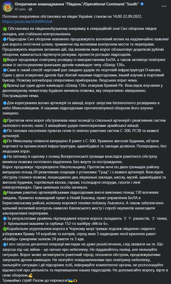 В четверг, 22 сентября, идет 211-й день полномасштабного российского вторжения в Украину.
