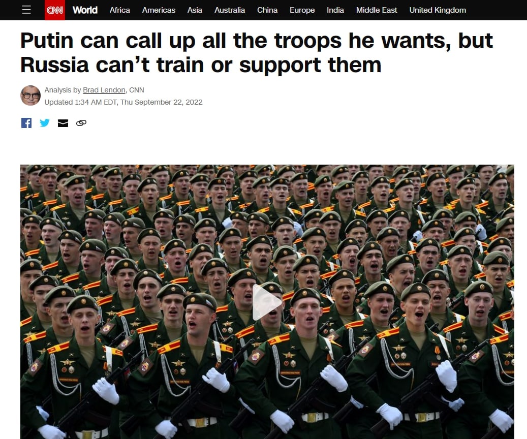 Также CNN пишет о том, что у РФ после мобилизации не получится обеспечить новые войска необходимым вооружением для ведения боевых действий в Украине.