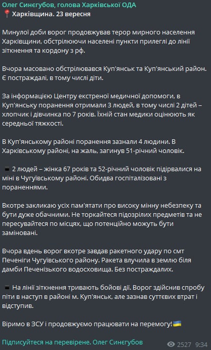 Об этом сообщил глава Харьковской ОВА Олег Синегубов.