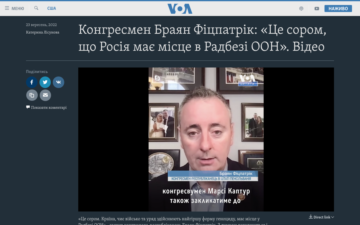 "Это будет двухпартийное обращение сопредседателей группы поддержки Украины в Конгрессе - навсегда исключить Россию из Совета Безопасности и вообще из ООН. Это позор для этой организации. Страна, чье войско и правительство активно осуществляют худшую форму геноцида, в этот самый момент пока мы разговариваем, имеет членство в Совете Безопасности ООН", - заявил Фицпатрик.