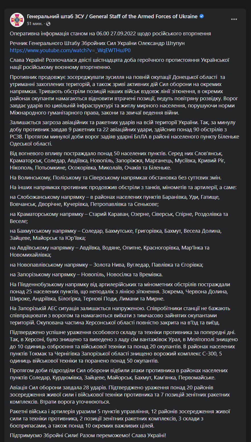 27 сентября в Украине идет уже 216-й день войны с Россией.