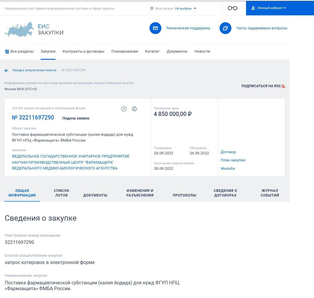 10:35 В российских телеграм-каналах ажиотаж из-за того, что на сайте госзакупок РФ появился тендер на закупку йодида калия.
