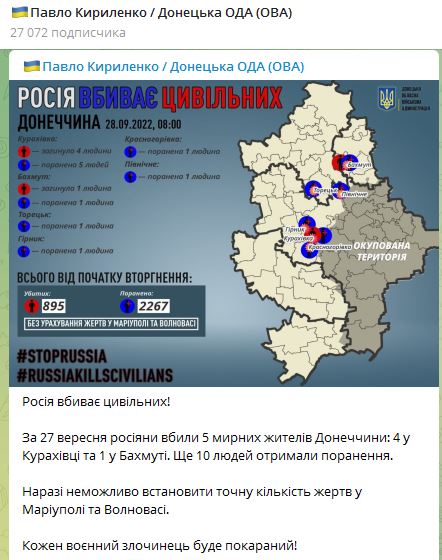 07.55 За минувшие сутки 27 сентября от действий армии РФ  в Донецкой области погибли 5 мирных жителей: 4 в Кураховке и 1 в Бахмуте. Еще 10 человек получили ранения.