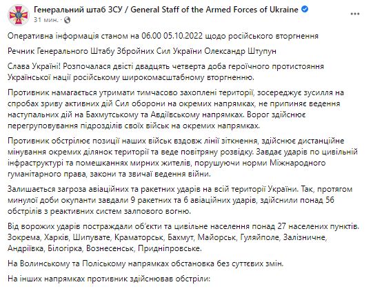 Утром 5 октября Генштаб ВСУ обнародовал сводку о ситуации на фронте.