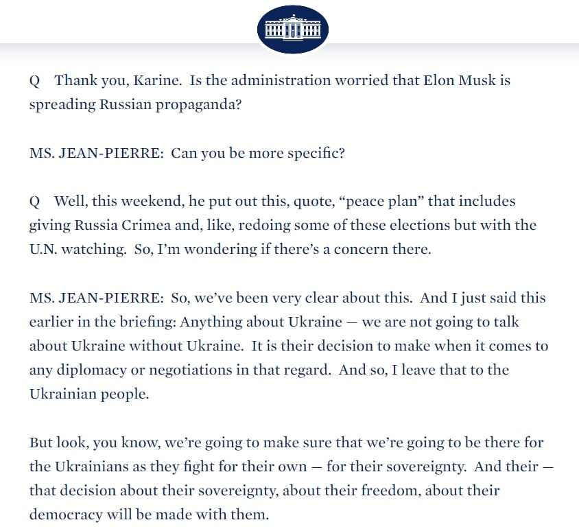 Пресс-секретарь Белого дома Карин Жан-Пьер сообщила на брифинге, что "мы не будем говорить об Украине без Украины" и что вопрос дипломатии она "оставляет украинскому народу".