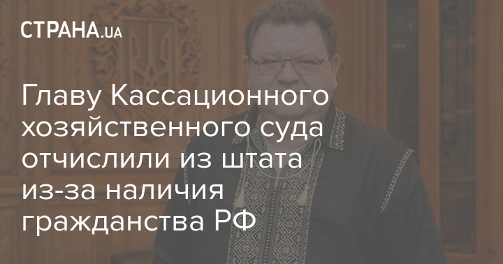Глава Кассационного хозяйственно суда в составе Верховного суда Украины Богдан Львов отчислен из штата суда решением главы Верховного суда Князевым. Причина - информация о наличии у Львова российского гражданства.