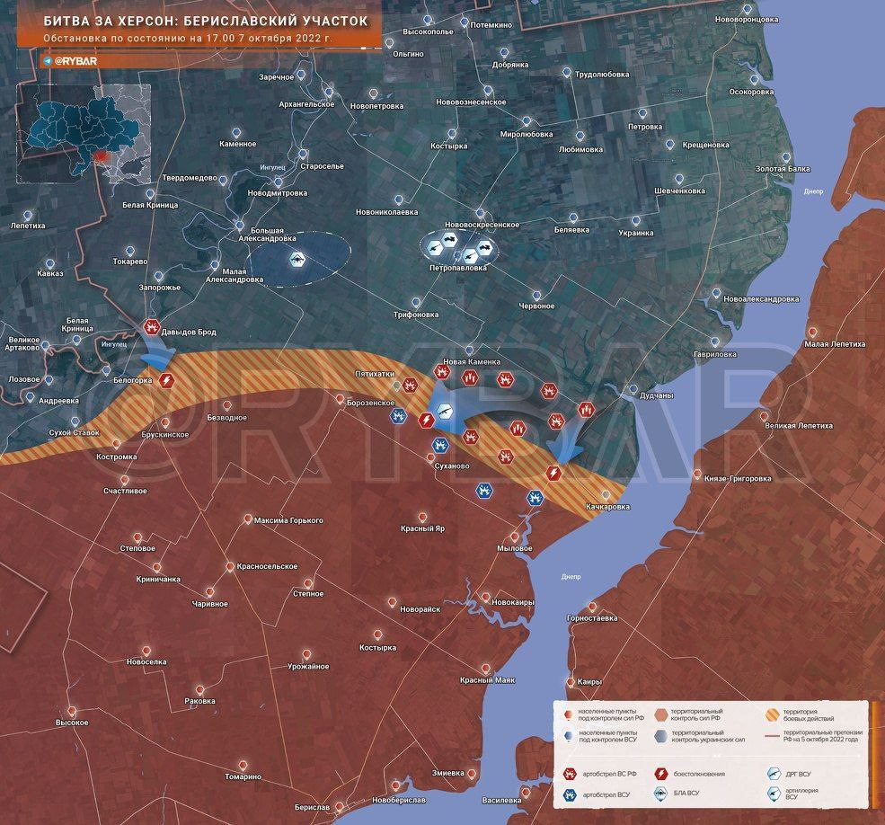 На юге, в Херсонской области ВСУ пошли в новое наступление по правому берегу Днепра в районе Дудчан, пишут российские военные паблики. Также идут украинские атаки на юг от Давыдова Брода. Российские "военкоры" сообщают об ударах российской артиллерии и авиации по наступающим войскам. О прорыве фронта украинскими силами на данный момент пока не сообщается.