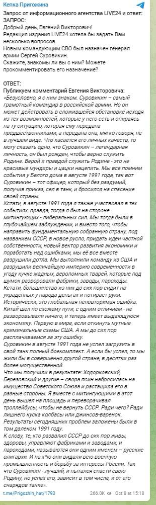 Он также заявляет, что еще в августе 1991 года, в дни ГКЧП, Суровикин "без раздумий, получив приказ, сел в танк, и бросился на спасение своей страны". Судя из контекста сообщения, он выполнял приказ ГКЧП, при том, что сам Пригожин, по его признанию, в этот момент был в другом лагере - либеральном (то есть, защитников Белого дома), о чем он сейчас жалеет.