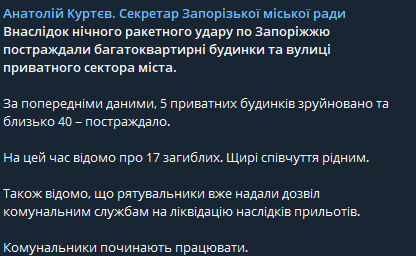 Всего по Запорожью этой ночью было выпущено 12 ракет. Кроме жилых домов (задело около 50 строений) пострадали объекты инфраструктуры.