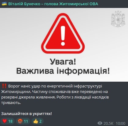 По энергетической инфраструктуре Житомирской области утром в понедельник, 10 октября, был нанесен удар.