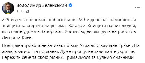 "229-й день полномасштабной войны. 229-й день нас пытаются уничтожить и стереть с лица земли. В целом. Уничтожить наших людей, которые спят дома в Запорожье. Убить людей, которые едут на работу в Днепре и Киеве.