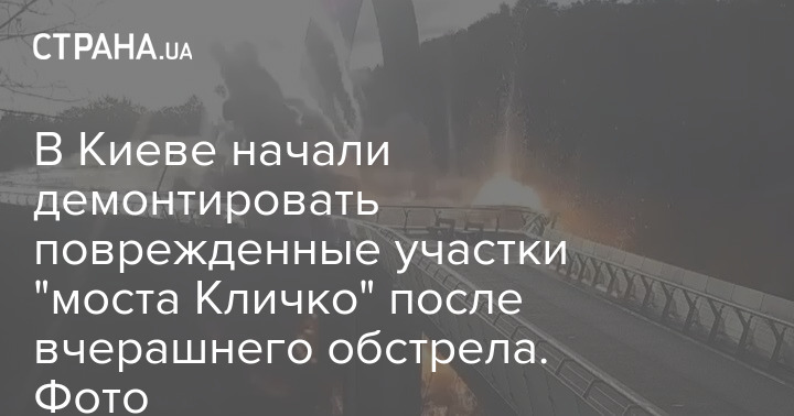 В Киеве начали демонтировать поврежденные участки "моста Кличко" после вчерашнего обстрела. Фото