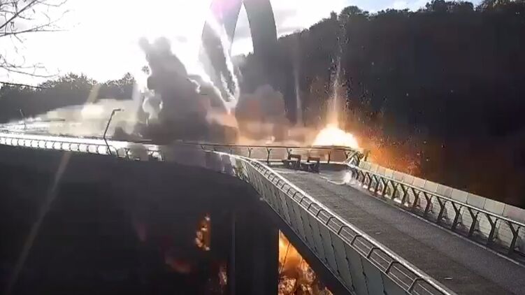 Во вторник, 11 октября, на пешеходно-велосипедном мосту в Киеве специалисты демонтировали поврежденные взрывом российской ракеты элементы стекла.