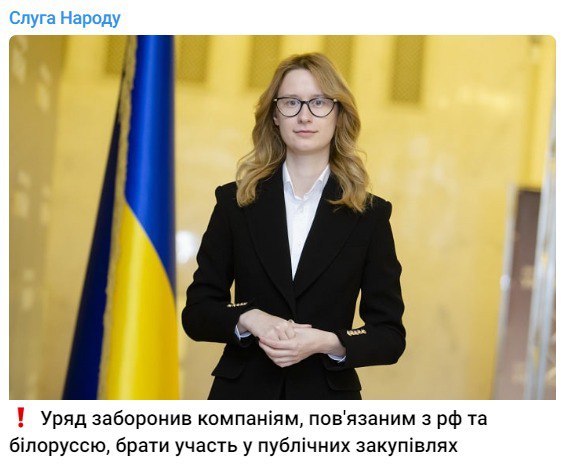"Отныне государственным заказчикам – органам власти, учреждениям и предприятиям – запрещено осуществлять закупки у поставщиков, связанных с РФ или Беларусью. Речь идет о государственных компаниях, юридических и физических лицах, зарегистрированных в России и Беларуси, а также о юридических лицах, где конечными бенефициарными владельцами являются резиденты РФ и РБ", - пояснила замглавы комитета Рады по вопросам экономического развития Роксолана Пидласа ("Слуга народа").