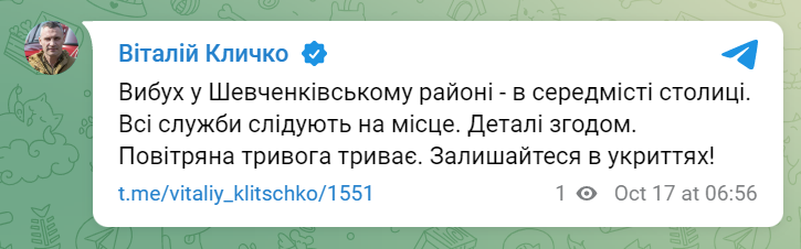 Утром в понедельник, 17 октября, в Киеве прогремел взрыв. В столице в это время объявлена воздушная тревога.