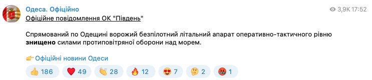 Над морем в районе Одессы силами ПВО сбили беспилотный летательный аппарат РФ оперативно-тактического уровня.